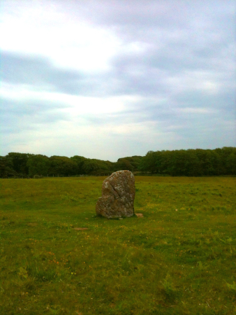 DEVIL'S QUOIT, STACKPOLE ELIDOR. A standing stone, 1.7m high by 1.5m by 0.4m, reset in 1978 in the course of excavations about its site: the stone was shown to have been erected on the site of a circular structure that burnt down about 1395 BC and was part of a complex setting of small stones; a cremation was inserted into this complex about 940 BC: a later Iron Age and Romano-British settlement, or ritual, non-settlement site was also encountered & recorded.