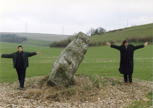 Travel west along the ancient route, which is now the A35, from the Neolithic causewayed enclosure that became the Iron Age hillfort of Maiden Castle past the spring at Winterbourne Abbas and west of Kingston Russell are the magnificent barrows of Martin's Down. A beautiful 198 metre long bank barrow lies across the end of the South Dorset ridgeway amongst long barrows and tumuli. Across the road and in a hollow is this leaning 2m wide stone. The alignment is NNW along the route at right angles to the bank barrow on the top of the hill.